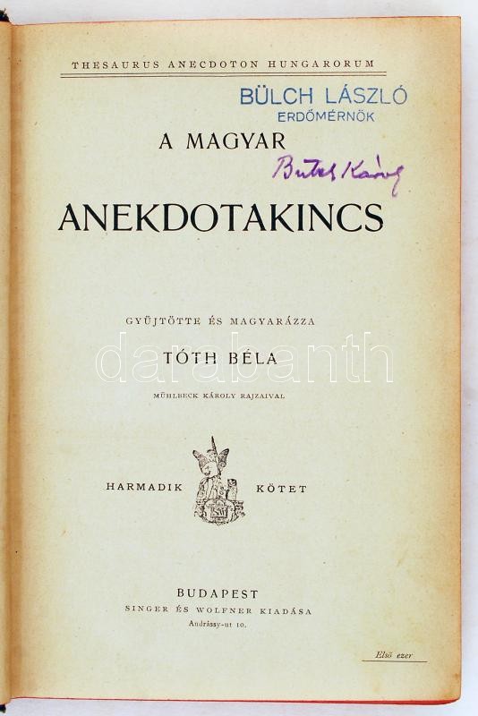 Gyűjtötte és magyarázza: -- /Thesaurus anecdoton hungarorum/ Bp., é.n. Singer és Wolfner. Díszes, dombornyomott, aranyozott, egészvászon kötésben, festett lapszélek. Tulajdonosi bejegyzésekkel, gerinc kissé kopottas.