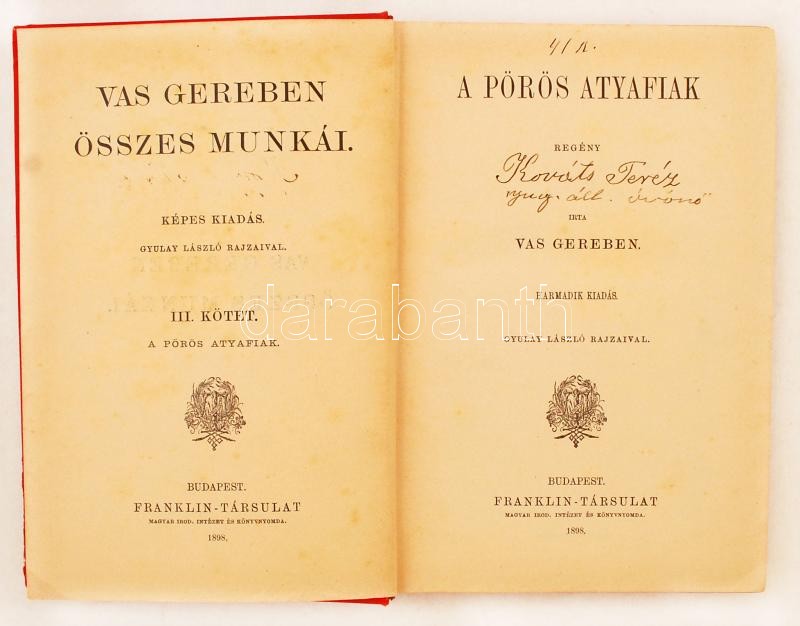 Vas Gereben Összes munkái. Képes kiadás. Gyulai László rajzaival. III. kötet. A Pörös atyafiak. Budapest, 1898, Franklin-Társulat. Díszes, illusztrált, kiadói egészvászon kötésben. Kissé foltos fedőborítóval, egyébként jó állapotban.