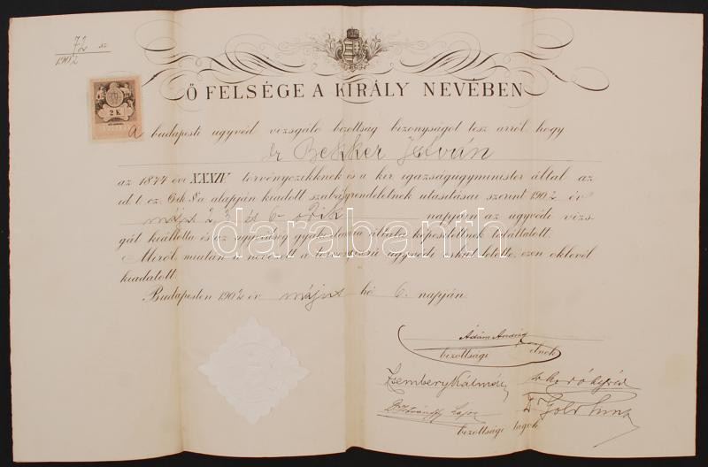 1902 Bp., Őfelsége a király nevében kiadott, az ügyvédi tevékenység gy... https://www.darabanth.com/de/230-Fernauktion/230.0/Andere-Sammelgebiete/Dokument~200030/1902-Bp-Ofelsege-a-kiraly-neveben-kiadott-az-ugyvedi-tevekenyseg-gyakorlasara-jogositC3~II1030949
