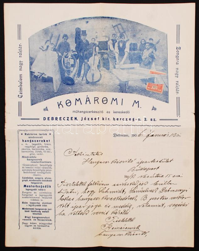 1906 Debrecen, A Komáromi M. műhangszerkészítő és kereskedő díszes fej... https://www.darabanth.com/de/230-Fernauktion/230.0/Andere-Sammelgebiete/Dokument~200030/1906-Debrecen-A-Komaromi-M-muhangszerkeszito-es-kereskedo-diszes-fejleces-levelpapirja~II1030506