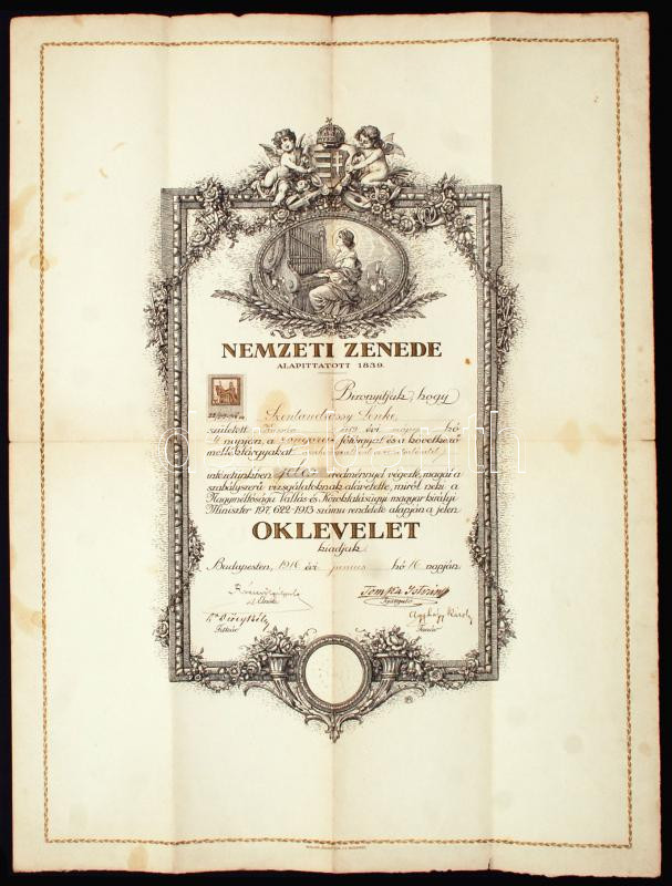 1916 Bp., A Nemzeti Zenede által a zongora főtárgy sikeres elvégzéséér... https://www.darabanth.com/de/230-Fernauktion/230.0/Andere-Sammelgebiete/Dokument~200030/1916-Bp-A-Nemzeti-Zenede-altal-a-zongora-fotargy-sikeres-elvegzeseert-kibocsatott-diszes-~II1032710
