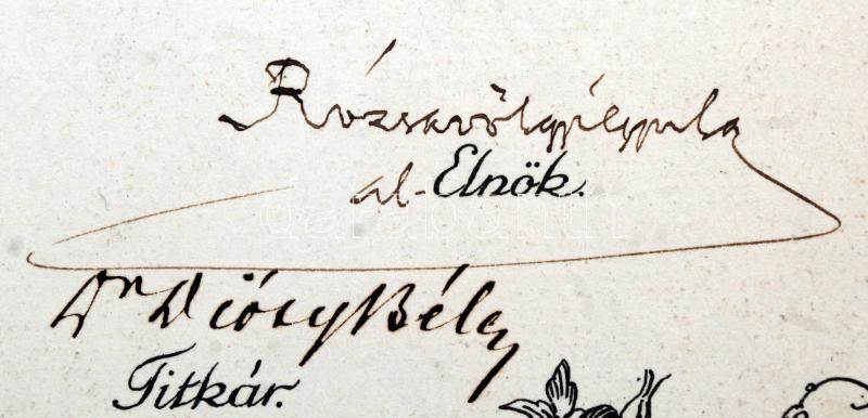 Beschreibung: 1916 Bp., A Nemzeti Zenede által a zongora főtárgy sikeres elvégzéséért kibocsátott díszes oklevele, rajta Rózsavölgyi Gyula aláírásával