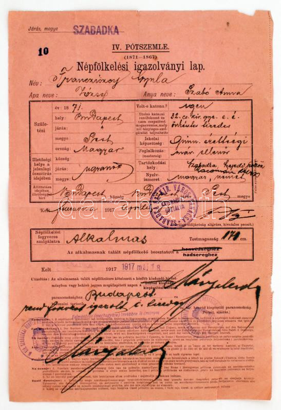 Beschreibung: 1917 Szabadka, MÁV ellenőr számára kiállított népfelkelési igazolványi lap, mely igazolja, hogy az egyén népfelkelési fegyveres szolgálatra alkalmas