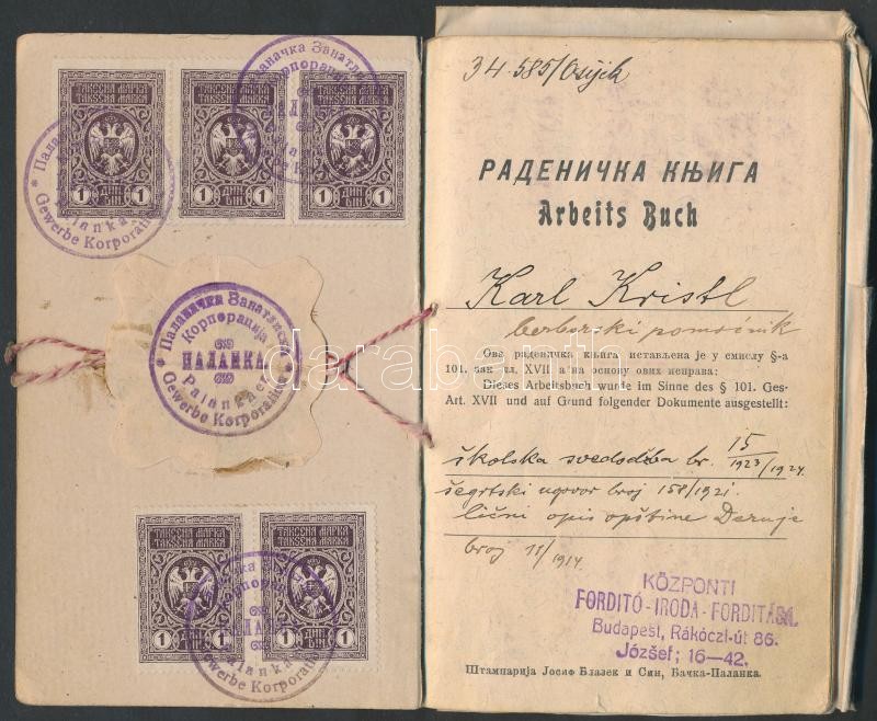 1924 Palánka, Kétnyelvű borbélysegéd részére kiállított munkakönyv sok... https://www.darabanth.com/de/230-Fernauktion/230.0/Andere-Sammelgebiete/Dokument~200030/1924-Palanka-Ketnyelvu-borbelyseged-reszere-kiallitott-munkakonyv-sok-bejegyzessel-es-o~II1031545