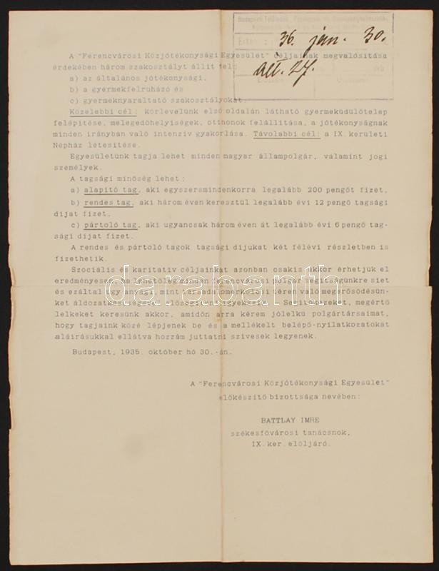 Beschreibung: 1935 Bp.IX., A Ferencvárosi Közjótékonysági Egyesület felhívása a szegények megsegítésére, gyermeknyaraltatásra, az egyleti tagok létszámának gyarapítására