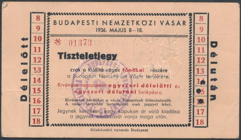 Beschreibung: 1936 Bp., Tiszteletjegy a Budapesti Nemzetközi Vásár kiállító cégeinek főnökei részére
