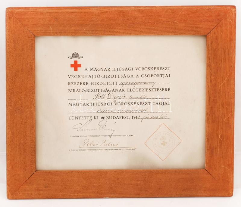 1942 Bp., A Magyar Ifjúsági Vöröskereszt Végrehajtó Bizottsága Csoportjaira részére hirdetett egészségversenyen elért eredményért adományozott oklevél keretben