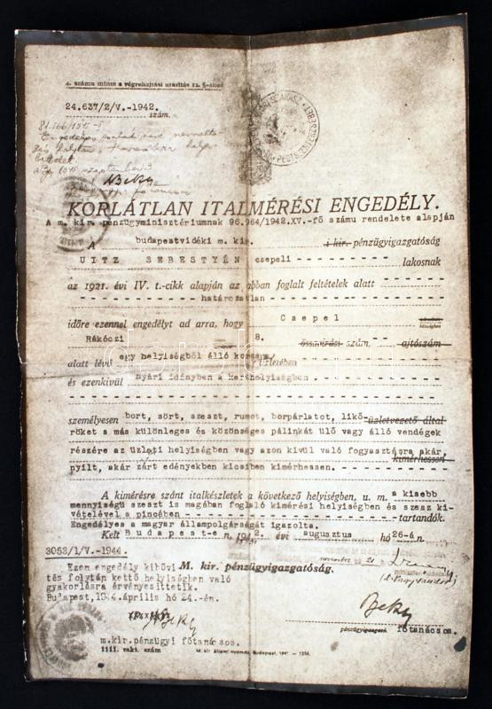 1942 Italmérési engedély korabeli másolata, hátoldalán eredeti hiteles... https://www.darabanth.com/de/230-Fernauktion/230.0/Andere-Sammelgebiete/Dokument~200030/1942-Italmeresi-engedely-korabeli-masolata-hatoldalan-eredeti-hitelesitessel-1950-bol~II1038283