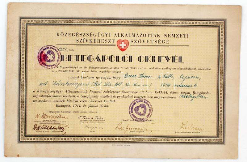 1944 Bp., A Közegészségügyi Alkalmazottak Nemzeti Szívkereszt Szövetsége által a betegápoló tanfolyam sikeres teljesítéséért kiállított betegápolói oklevél