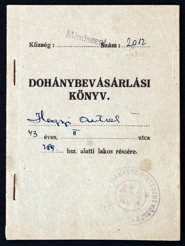 1944 Mindszent, Névre szóló dohánybevásárlási utalványkönyv https://www.darabanth.com/de/230-Fernauktion/230.0/Andere-Sammelgebiete/Dokument~200030/1944-Mindszent-Nevre-szolo-dohanybevasarlasi-utalvanykonyv~II1034043