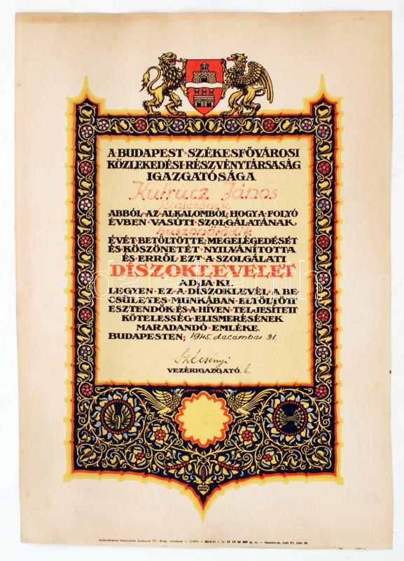 Beschreibung: 1945 Bp., Budapest Székesfővárosi Közlekedési Részvénytársaság Igazgatósága által 25. szolgálati év alkalmából adományozott díszoklevele