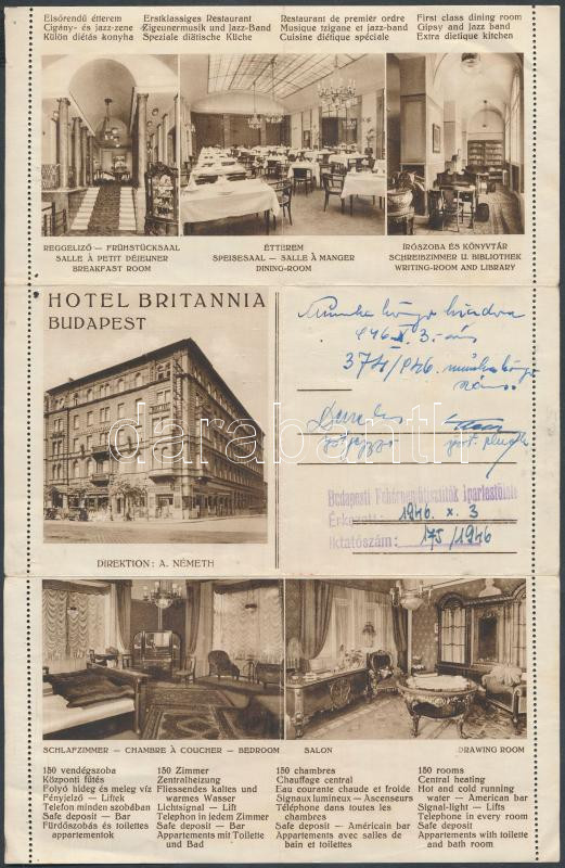 1946 Bp.VI., A Hotel Britannia díszes szórólapjára kiállított munkálta... https://www.darabanth.com/de/230-Fernauktion/230.0/Andere-Sammelgebiete/Dokument~200030/1946-BpVI-A-Hotel-Britannia-diszes-szorolapjara-kiallitott-munkaltatoi-igazolas~II1031332