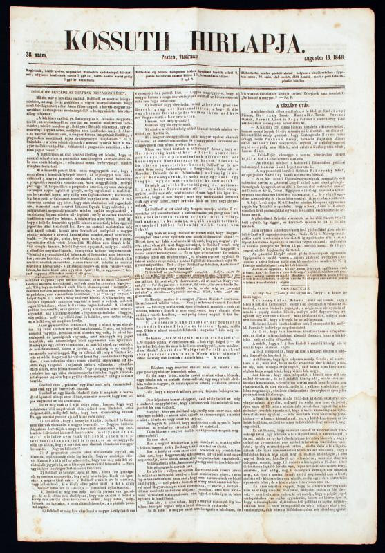 1848 Pest, Kossuth Hírlapja, a politikai napilap augusztus 13-dikai sz... https://www.darabanth.com/de/230-Fernauktion/230.0/Andere-Sammelgebiete/Drucksachen~200004/1848-Pest-Kossuth-Hirlapja-a-politikai-napilap-augusztus-13-dikai-szama-orszaggyulesi-hirekk~II1032670
