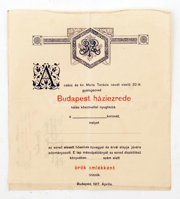 Beschreibung: 1917 Bp., A Csász. és Kir. Mária Terézia nevét viselő 32. gyalogezred Budapest háziezredének adományokat köszönő kitöltetlen emléklapja
