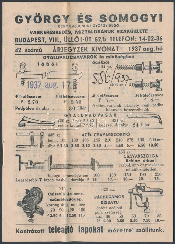 1937 Bp.VIII., György és Somogyi vaskereskedés, asztalosáruk szaküzlet... https://www.darabanth.com/de/230-Fernauktion/230.0/Andere-Sammelgebiete/Drucksachen~200004/1937-BpVIII-Gyorgy-es-Somogyi-vaskereskedes-asztalosaruk-szakuzletenek-abrakkal-illusztr~II1031045