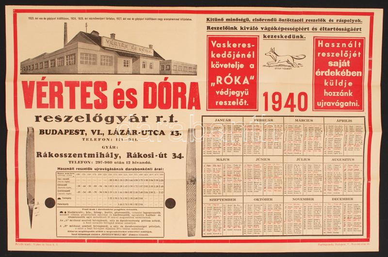 1940 Bp. VI., A Vértes és Dóra reszelőgyár r.t. 1940. évi levelezőlapként feladható nagyméretű reklámnaptára, rajta a gyár kiállításokon elnyert kitüntetéseinek felsorolásával, 47x31 cm
