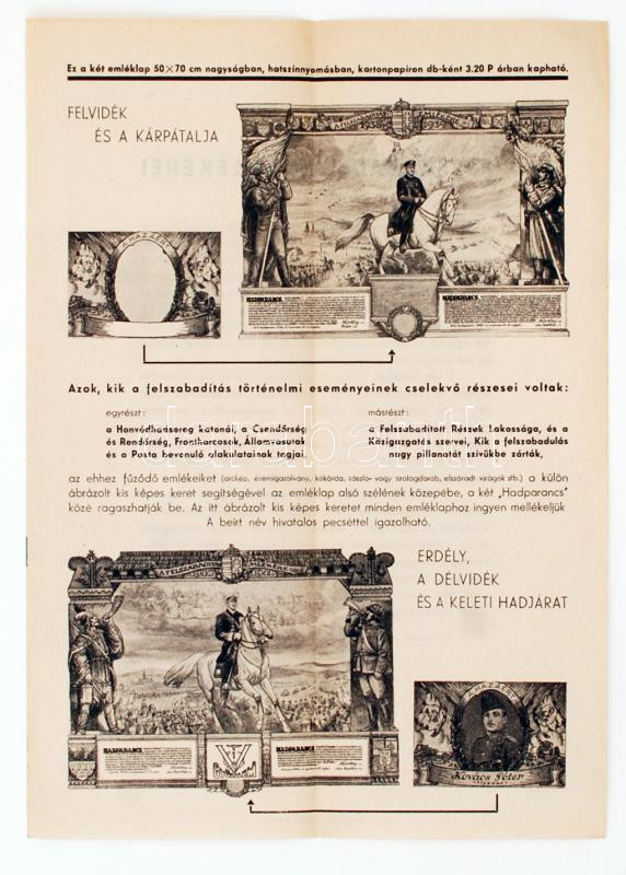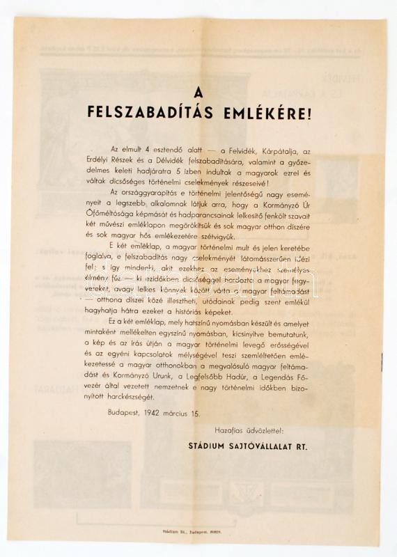 Beschreibung: 1942 Bp., "A felszabadítás emlékére!" A Stádium Sajtóvállalat Rt. által kiadott emléklapot népszerűsítő nyomtatvány illusztrációval