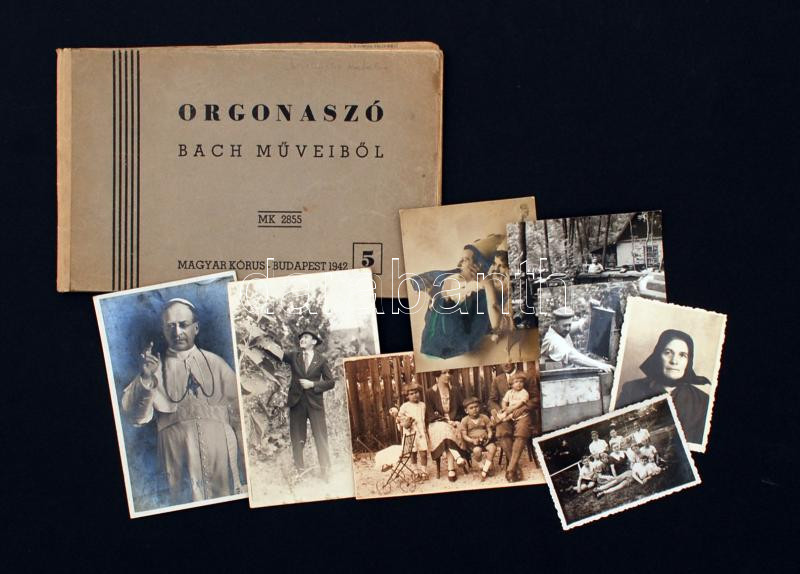 1942 Orgonaszó Bach J. S. műveiből. Vál. Papp Géza. Bp., melléklet a Magyar Kórus 47. számához, 1942 ősz. Kicsit laza papírkötésben, egyébként jó állapotban. + 8 db különféle érdekes régi fotó, nagy része a hátulján feliratozott, különböző méretben