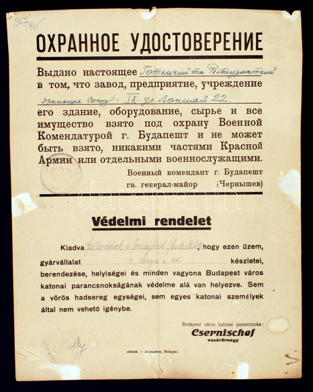 1945 Budapest város katonai parancsnoka, Csernischef által a Szállodás... https://www.darabanth.com/de/230-Fernauktion/230.0/Andere-Sammelgebiete/Drucksachen~200004/1945-Budapest-varos-katonai-parancsnoka-Csernischef-altal-a-Szallodasok-es-Vendeglosok-Ipar~II1031997