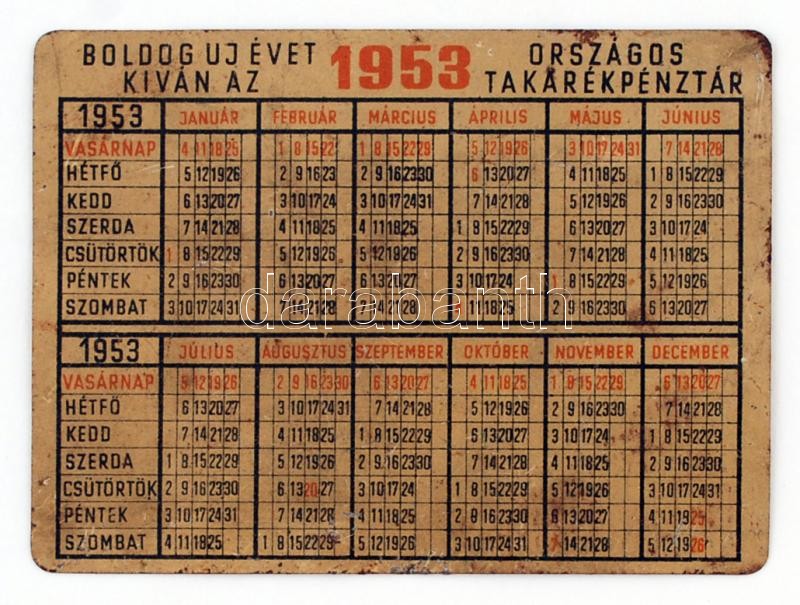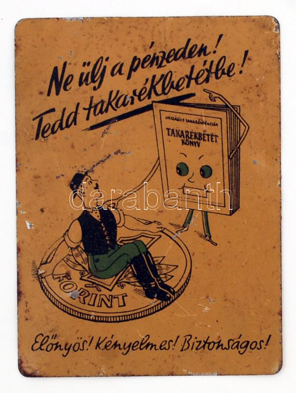 Beschreibung: 1953 "Ne ülj a pénzeden! Tedd takarékbetétbe! Boldog új évet kíván az Országos Takarékpénztár", lemezből készült kártyanaptár, 7x10 cm