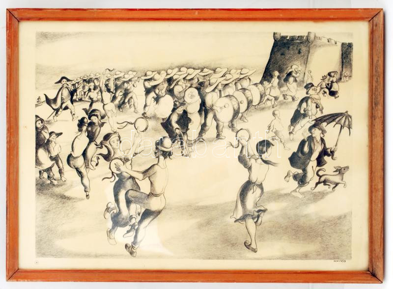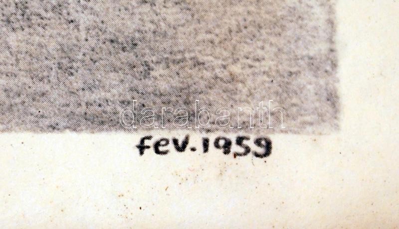 Beschreibung: Vigadalom, a 8. sz. rajz Alvaro Cunhal Börtönrajzok c. kötetéből (Bp., 1979, Corvina - Editorial Avante), nyomat, papír, üvegezett fa keretben, 30×42,5 cm