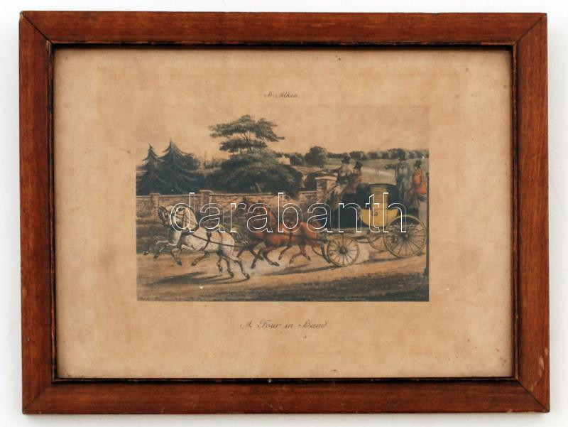 Beschreibung: cca 1900 A Four in Hand, Henry Alken (1785-1851) metszetéről készült nyomat, jelzett, papír, üvegezett fa keretben, 8×11,5 cm