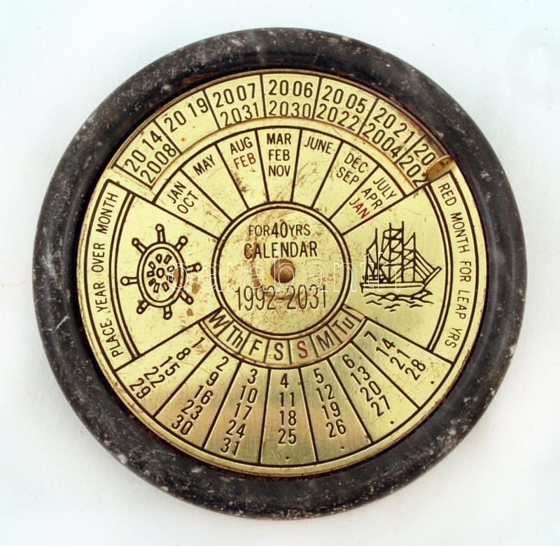 Alabástrom és réz, tengerész örök naptár (1992-2031), forgatható előla... https://www.darabanth.com/de/230-Fernauktion/230.0/Andere-Sammelgebiete/Flohmarkt~200021/Alabastrom-es-rez-tengeresz-orok-naptar-1992-2031-forgathato-elolappal-d8cm~II1032501