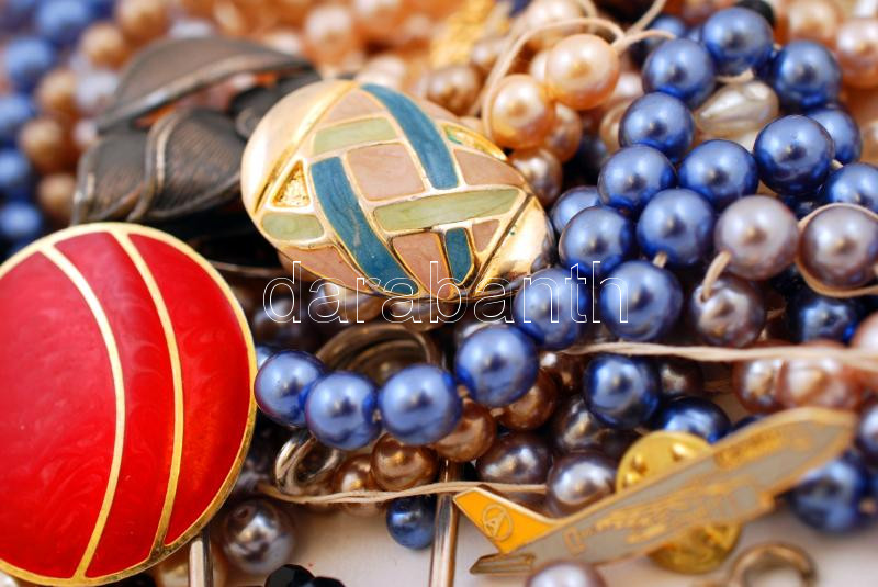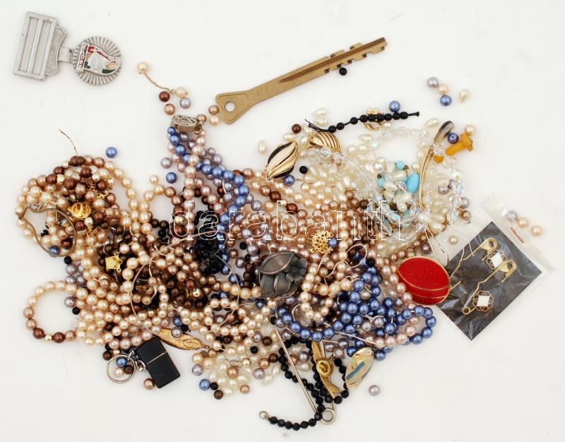 Beschreibung: Bizsu tétel, benne: nyaklánc, karkötő, fülbevaló, öngyújtó-kulcstartó, medál, kulcs, válltű, több sérült