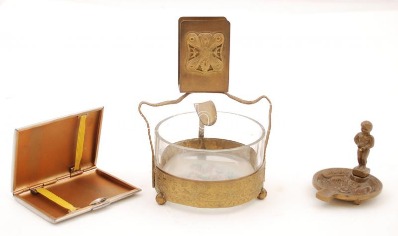 Beschreibung: Dohányzással kapcsolatos tétel: dekoratív antik hatású hamuzótál és gyufatartó, cigarettatárca, kis hamuzótál