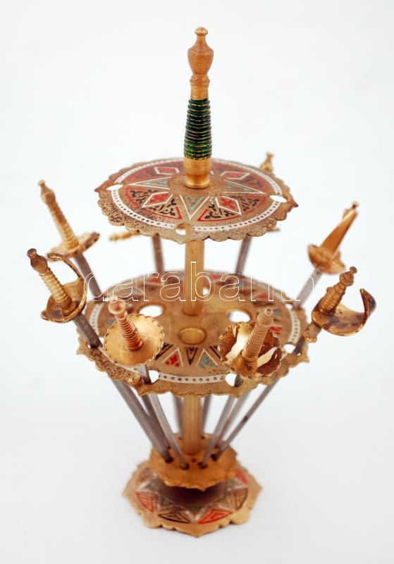 Beschreibung: Gazdagon díszített, 8 darabos többszintes spanyol gyártmányú réz szendvicstűző szett, díszes tartóval
