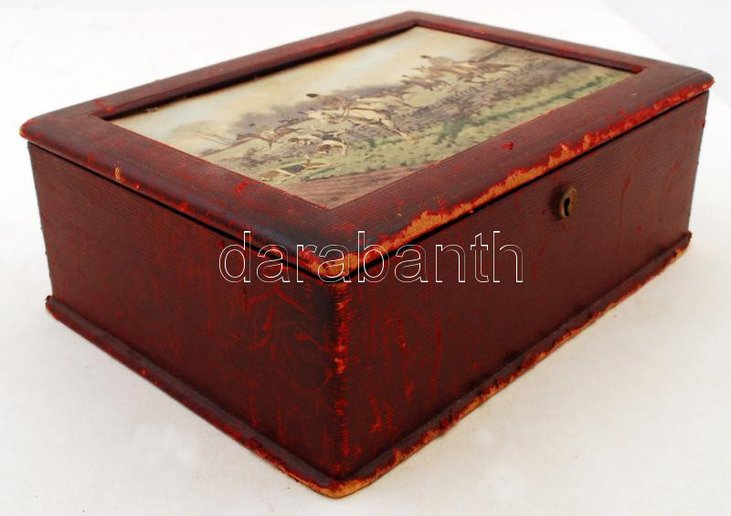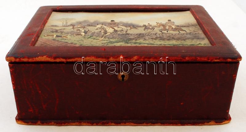 Beschreibung: Régi, bőr borítású fa doboz, tetején lovas vadászjelenetet ábrázoló képpel, 29,5×22×10,5 cm