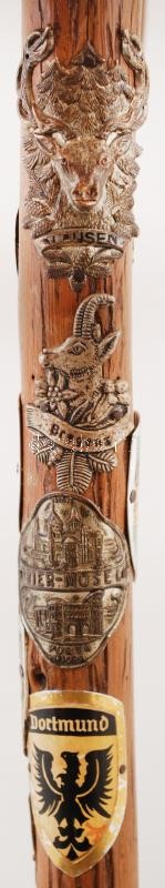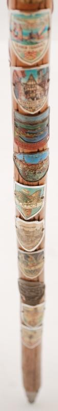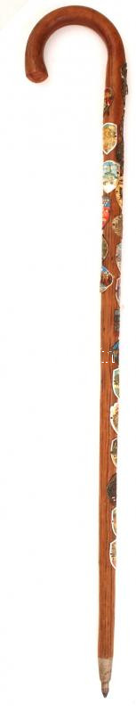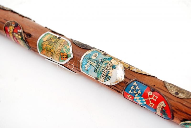 Beschreibung: Régi fából készült túrabot 22 db különféle, német városokat ábrázoló jelvénnyel, h: 88,5 cm