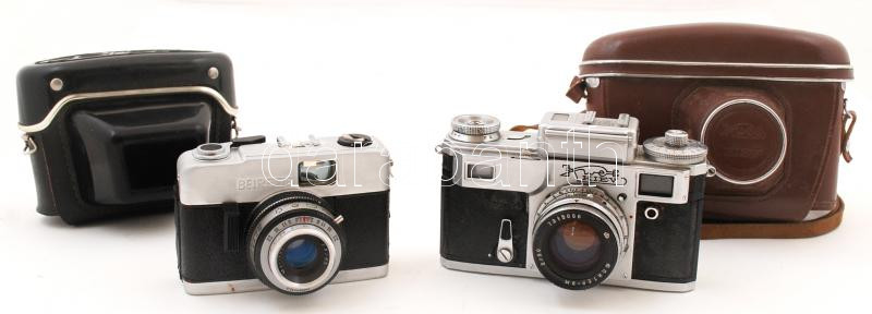 cca 1974 Beirette 2,8/45 fényképezőgép bőr tokban; Kiev 2/50 féynképezőgép bőr tokban /