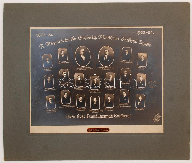 Beschreibung: 1924 A Magyaróvári kir. Gazdasági Akadémia Segélyző Egylete tablója, 20 nevesített portréval, Kumpf Antal magyaróvári műterméből, 21,5x29 cm, karton 35x42 cm