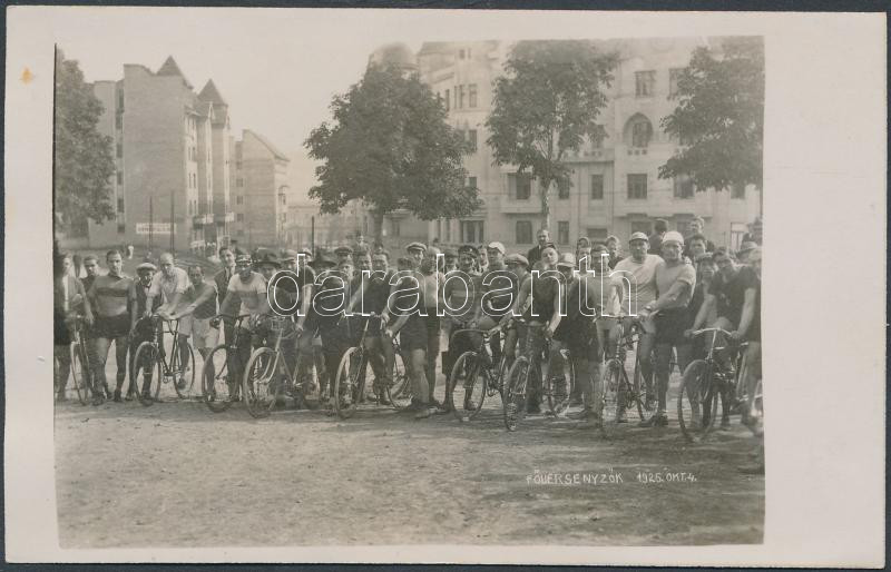 Beschreibung: 1925. október 4. Budapest, kerékpárversenyzők startra készen, fotólap, 9x14 cm