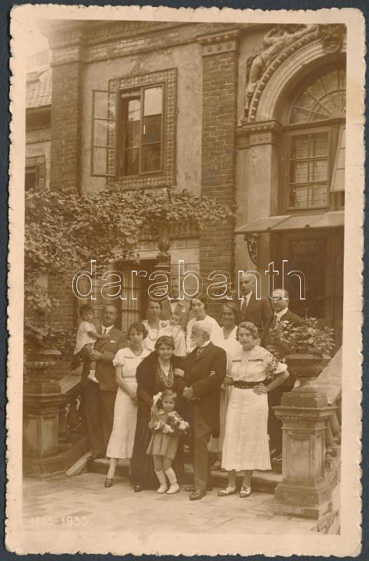 1933 A Zsolnay család a Zsolnay manufaktúra épülete előtt, fotólap hátoldalán személyes üzenettel(valószínűleg Mattyasovszky Margit írta, 1961-re dátumozva), 9x14 cm