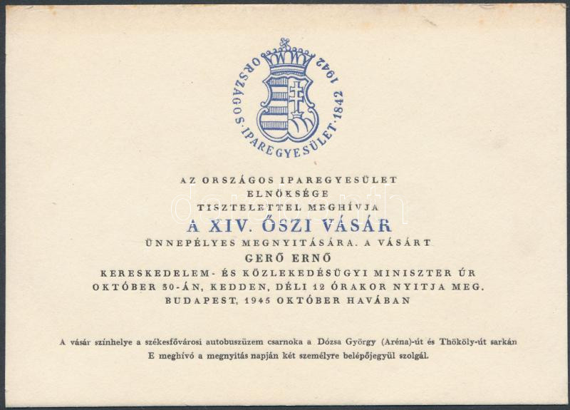 1945 Bp., Meghívó az Országos Iparegyesület Elnökségének XIV. Őszi Vás... https://www.darabanth.com/de/230-Fernauktion/230.0/Andere-Sammelgebiete/Foto~200035/1945-Bp-Meghivo-az-Orszagos-Iparegyesulet-Elnoksegenek-XIV-Oszi-Vasarara-melyet-Gero~II1031454