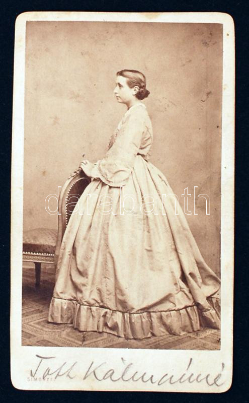 cca 1890 Majthényi Flóra (1837-1915) költőnő, Tóth Kálmán költő felesége, akitől később elvált. Kiváló zenetehetség, több zeneszerzeménye is fennmaradt. Keményhátú kabinetfotó Simonyi fényírdájából, Pest, 10,5x6,5cm