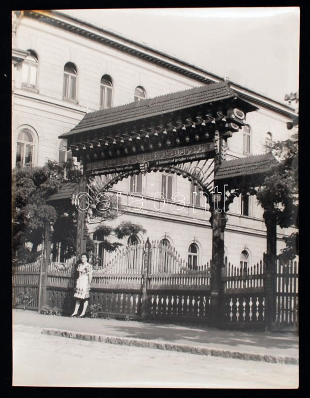 cca 1940 Korschelt Miklós (1900-1982): A győri Révai Miklós Gimnázium ifjúsági sportkörének testgyakorló tere székelykapus bejárata, pecséttel jelzett vintage fotó, 24x18 cm