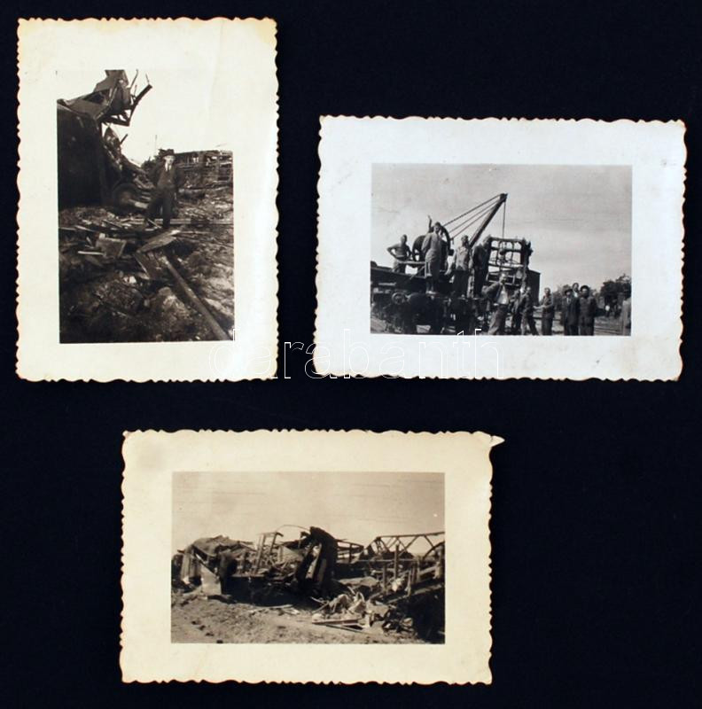 Beschreibung: cca 1945 A Szolnoki pályaudvar a bombázások után, 3 db fotó, hátoldalon feliratozva, 5x8 cm