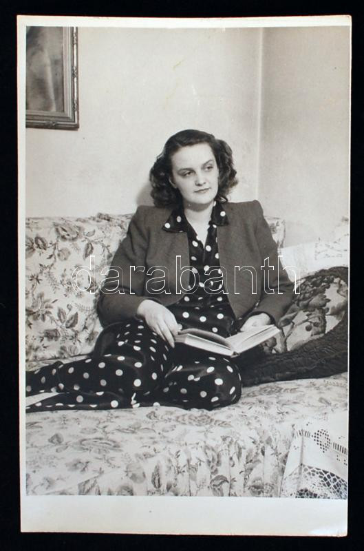 Beschreibung: cca 1950 Tolnay Klári (1914-1998) kétszeres Kossuth-díjas színésznő otthonában, kényelmesen olvasgatva, Rozgonyi felvétele, 18x12 cm