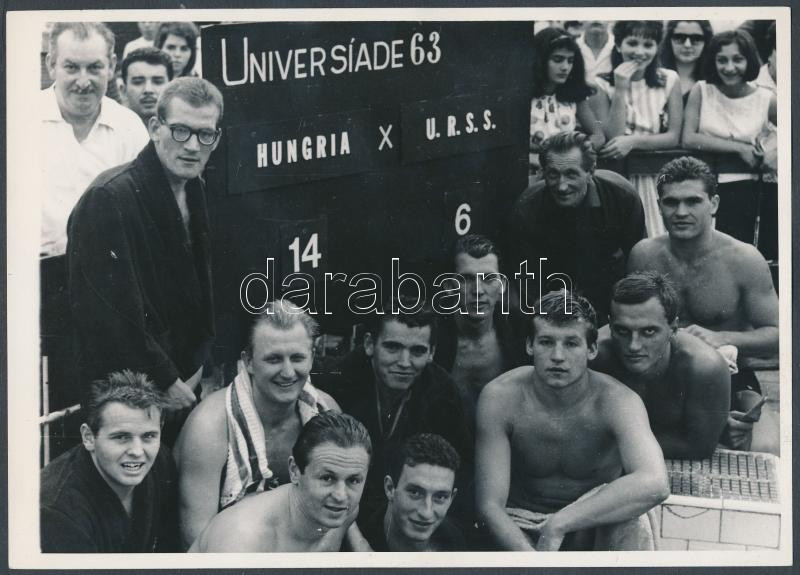 Beschreibung: cca 1960-1965 Laky Károly mesteredző a vízilabda csapat társaságában, Magyarország-Oroszország 14-6, 18x13 cm