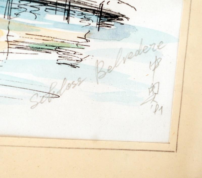 Beschreibung: Olvashatatlan jelzéssel: Schloss Belvedere. Tus-akvarell, papír, üvegezett keretben, 16×22 cm