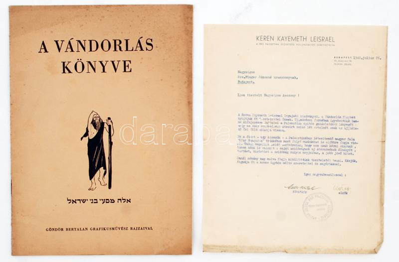 1942 Keren Kayemeth Leisrael Pro Plaesztina Szövetség Kolonizációs Szakosztálya a Vándorlás Könyvét ajánlja fel annak érdekében, hogy a Palesztinában létesítendő magyar falu "Kfar Hungaria" érdekében tett felajánlások a folyó munkát vigyék előbbre. A tételben foglaltatik a levél és a Vándorlás könyve Göndör Bertalan grafikusművész rajzaival.
