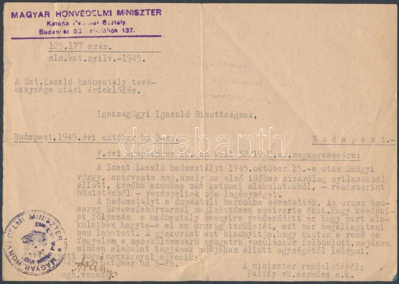 Beschreibung: 1945 Bp., A magyar honvédelmi miniszter megbízásából az Igazságügyi Igazoló Bizottságnak címzett, a Szt. László hadosztály tevékenységéről beszámoló levél