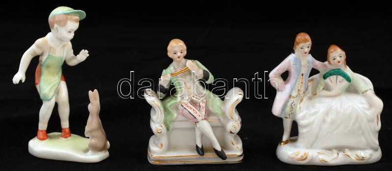 3 db figurális porcelán: barokk pár, barokk férfi, jelzés nélkül, apró kopásnyomokkal, különböző méretben + Aquincumi porcelán kisfiú nyúllal, jelzett, apró kopásnyomokkal, m: 12 cm