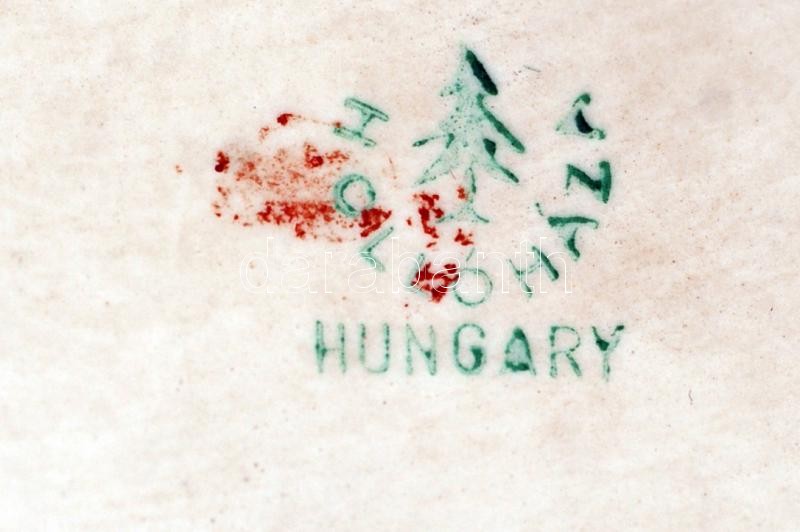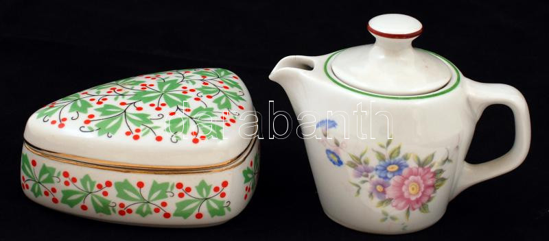 Hollóházi porcelán kiöntő, matricás, jelzett, hibátlan, m: 10,5 cm + Hollóházi porcelán bonbonier, matricás, jelzett, hibátlan, 10×13×5,5 cm