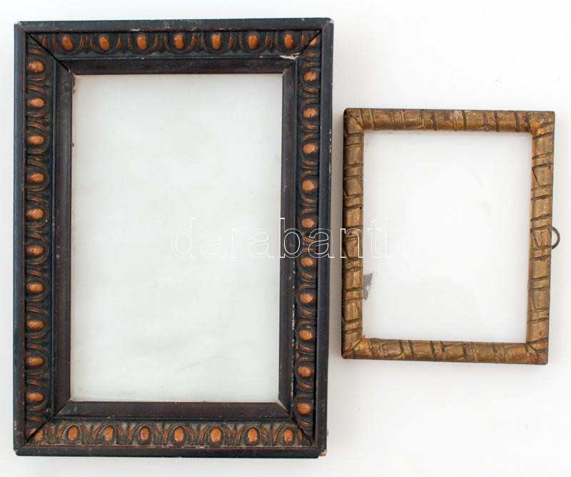 Beschreibung: 2 db díszes fa képkeret, benne üveggel, belső méret: 8×10 ill. 15.5×10 cm, külső méret: 10×12 ill. 20,5×14,5 cm