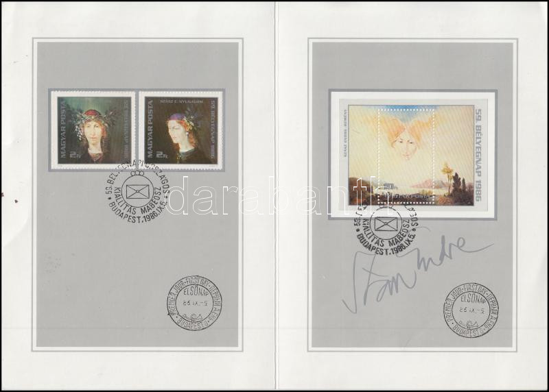 Beschreibung: 1986 Szász Endre (1926-2003) festőművész nyomtatott aláírása az 59. bélyegnap bélyegekkel díszített emléklapon
