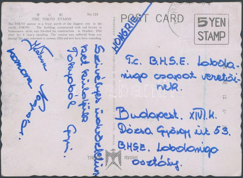 Beschreibung: A Budapesti Honvéd Sportegyesület 3 focistájának (Nógrádi, Katona, Komora) aláírása a Tokióból hazaküldött képeslapon